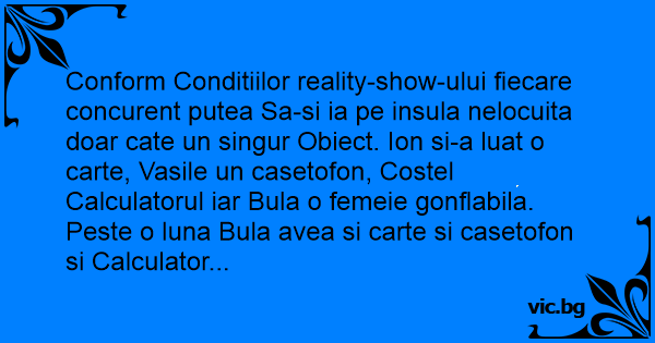 Conform Conditiilor reality-show-ului fiecare concurent putea Sa-si ia pe insula nelocuita doar cate un singur Obiect. Ion si-a luat o carte, Vasile un casetofon, Costel Calculatorul iar Bula o femeie gonflabila. Peste o luna Bula avea si carte si casetofon si Calculator...