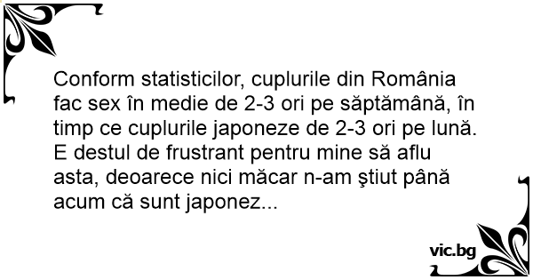 Conform statisticilor, cuplurile din România fac sеx în medie de 2-3 ori pe săptămână, în timp ce cuplurile japoneze de 2-3 ori pe lună. E destul de frustrant pentru mine să aflu asta, deoarece nici măcar n-am ştiut până acum că sunt japonez...