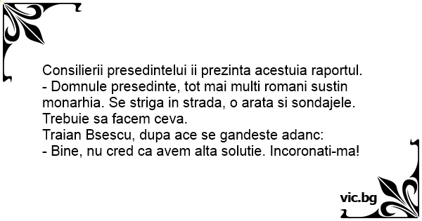 - Domnule presedinte, tot mai multi romani sustin monarhia. Se striga in strada, o arata si sondajele. Trebuie sa facem ceva.