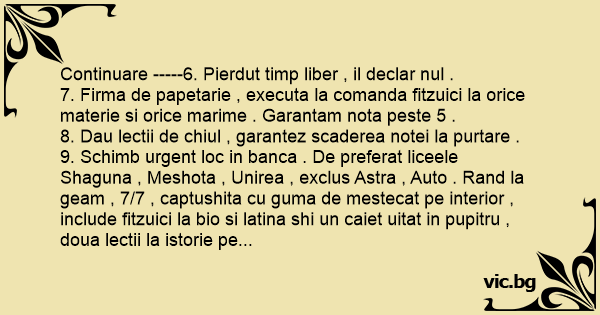 9. Schimb urgent loc in banca . De preferat liceele Shaguna , Meshota , Unirea , exclus Astra , Auto . Rand la geam , 7/7 , captushita cu guma de mestecat pe interior , include fitzuici la bio si latina shi un caiet uitat in pupitru , doua lectii la istorie pe banca , putin scrijelita in partea dreapta .
