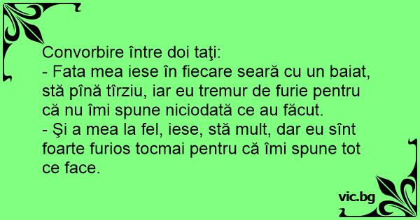 - Fata mea iese în fiecare seară cu un baiat, stă pînă tîrziu, iar eu tremur de furie pentru că nu îmi spune niciodată ce au făcut.