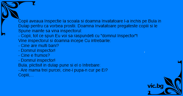Copii aveaua Inspectie la scoala si doamna Invatatoare l-a inchis pe Bula in Dulap pentru ca vorbea prostii. Doamna Invatatoare pregateste copiii si le Spune inainte sa vina inspectorul: