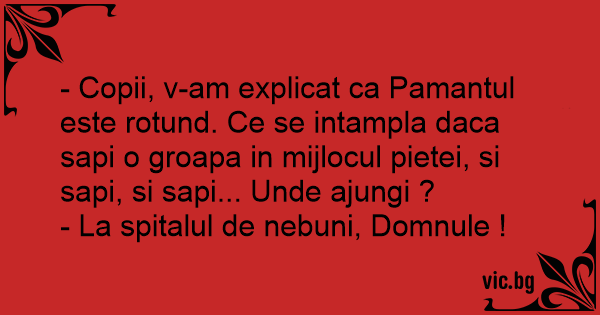- Copii, v-am explicat ca Pamantul este rotund. Ce se intampla daca sapi o groapa in mijlocul pietei, si sapi, si sapi... Unde ajungi ?