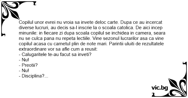 Copilul unor evrei nu vroia sa invete deloc carte. Dupa ce au incercat diverse lucruri, au decis sa-l inscrie la o scoala catolica. De aici incep minunile: in fiecare zi dupa scoala copilul se inchidea in camera, seara nu se culca pana nu repeta lectiile. Vine sezonul lucrarilor asa ca vine copilul acasa cu carnetul plin de note mari. Parintii uluiti de rezultatele extraordinare vor sa afle сuм a reusit: