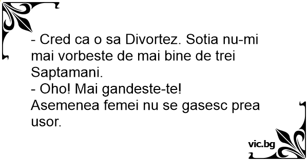 - Cred ca o sa Divortez. Sotia nu-mi mai vorbeste de mai bine de trei Saptamani.