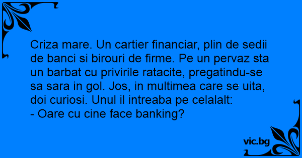 Criza mare. Un cartier financiar, plin de sedii de banci si birouri de firme. Pe un pervaz sta un barbat cu privirile ratacite, pregatindu-se sa sara in gol. Jos, in multimea care se uita, doi curiosi. Unul il intreaba pe celalalt: