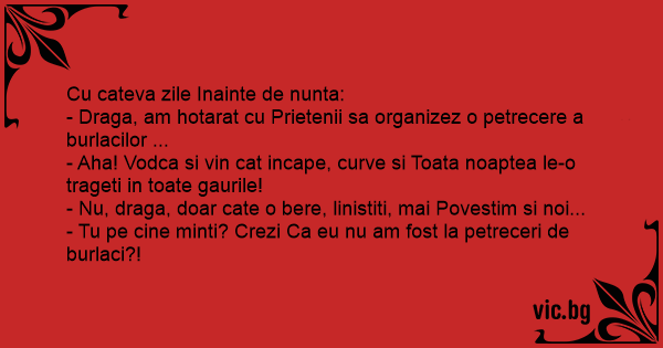 - Tu pe cine minti? Crezi Ca eu nu am fost la petreceri de burlaci?!
