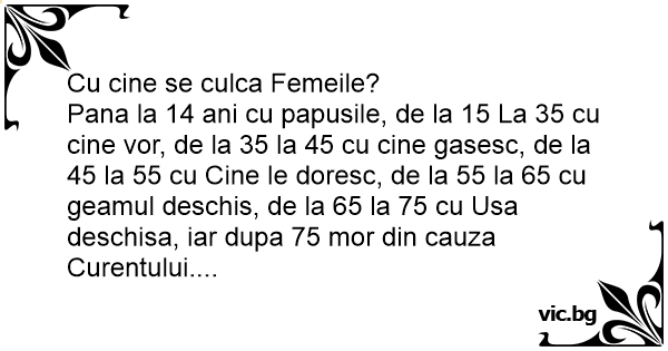 Pana la 14 ani cu papusile, de la 15 La 35 cu cine vor, de la 35 la 45 cu cine gasesc, de la 45 la 55 cu Cine le doresc, de la 55 la 65 cu geamul deschis, de la 65 la 75 cu Usa deschisa, iar dupa 75 mor din cauza Curentului....