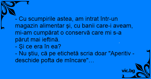 - Cu scumpirile astea, am intrat într-un magazin alimentar şi, cu banii care-i aveam, mi-am cumpărat o conservă care mi s-a părut mai ieftină.