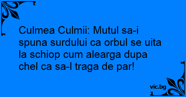 Culmea Culmii: Mutul sa-i spuna surdului ca orbul se uita la schiop сuм alearga dupa chel ca sa-l traga de par!