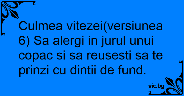 Culmea vitezei(versiunea 6) Sa alergi in jurul unui copac si sa reusesti sa te prinzi cu dintii de fund.