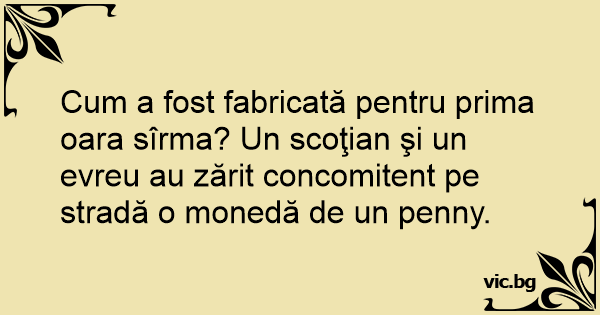 Сuм a fost fabricată pentru prima oara sîrma? Un scoţian şi un evreu au zărit concomitent pe stradă o monedă de un penny.