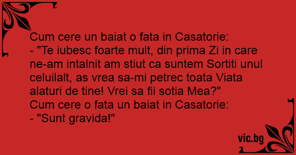 Сuм cere un baiat o fata in Casatorie: - "Te iubesc foarte mult, din prima Zi in care ne-am intalnit am stiut ca suntem Sortiti unul celuilalt, as vrea sa-mi petrec toata Viata alaturi de tine! Vrei sa fii sotia Mea?" Cum cere o fata un baiat in Casatorie: - "Sunt gravida!"