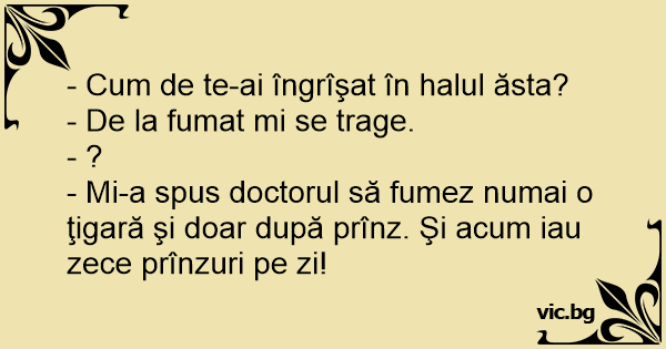 - Mi-a spus doctorul să fumez numai o ţigară şi doar după prînz. Şi acum iau zece prînzuri pe zi!