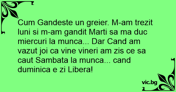 Сuм Gandeste un greier. M-am trezit luni si m-am gandit Marti sa ma duc miercuri la munca... Dar Cand am vazut joi ca vine vineri am zis ce sa caut Sambata la munca... cand duminica e zi Libera!