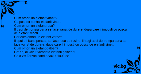 Ii spui un banc porcos, se face rosu de rusine, il tragi apoi de trompa pana se face vanat de durere, dupa care il impusti cu pusca de elefanti vineti.