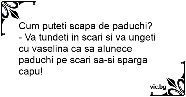 Сuм puteti scapa de paduchi?<br />- Va tundeti in scari si va ungeti cu vaselina ca sa alunece paduchi pe scari sa-si sparga capu!