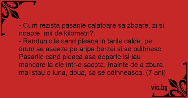 - Randunicile cand pleaca in tarile calde, pe drum se aseaza pe aripa berzei si se odihnesc. Pasarile cand pleaca asa departe isi iau mancare la ele intr-o sacota. Inainte de a zbura, mai stau o luna, doua, sa se odihneasca. (7 ani)