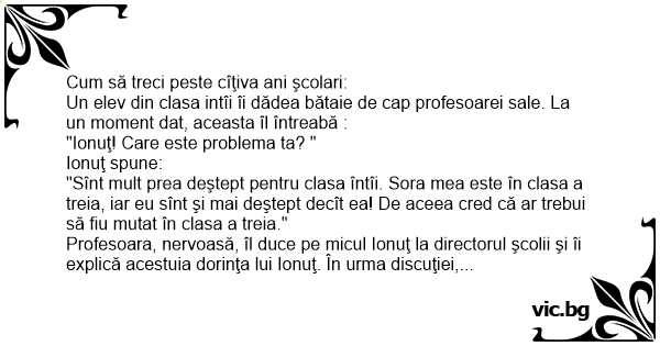 Şi tot aşa, răspunde la toate întrebările la care un elev de clasa a treia ar trebui să ştie să răspunda. Micul Ionuţ părea să se descurce foarte bine. Directorul, privind spre profesoara acestuia, îi spune "Cred că Ionuţ poate să fie mutat direct în clasa a treia."
