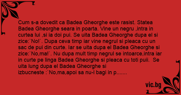 Сuм s-a dovedit ca Badea Gheorghe este rasist. Statea Badea Gheorghe seara in poarta. Vine un negru ,intra in curtea lui ,si ia doi pui. Se uita Badea Gheorghe dupa el si zice:`No!`. Dupa ceva timp iar vine negrul si pleaca cu un sac de pui din curte. Iar se uita dupa el Badea Gheorghe si zice:`No,ma!`. Nu dupa mult timp negrul se intoarce,intra iar in curte pe linga Badea Gheorghe si pleaca cu toti puii. Se uita lung dupa el Badea Gheorghe si izbucneste :`No,ma,apoi sa nu-l bagi in p.... ma-sii.