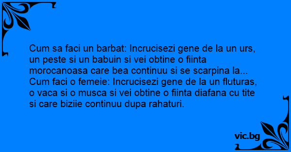 Сuм sa faci un barbat: Incrucisezi gene de la un urs, un peste si un babuin si vei obtine o fiinta morocanoasa care bea continuu si se scarpina la...