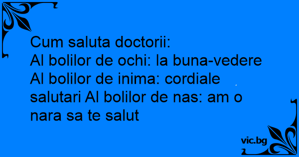 Al bolilor de ochi: la buna-vedere Al bolilor de inima: cordiale salutari Al bolilor de nas: am o nara sa te salut