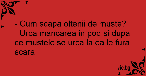 - Сuм scapa oltenii de muste?<br />- Urca mancarea in pod si dupa ce mustele se urca la ea le fura scara!