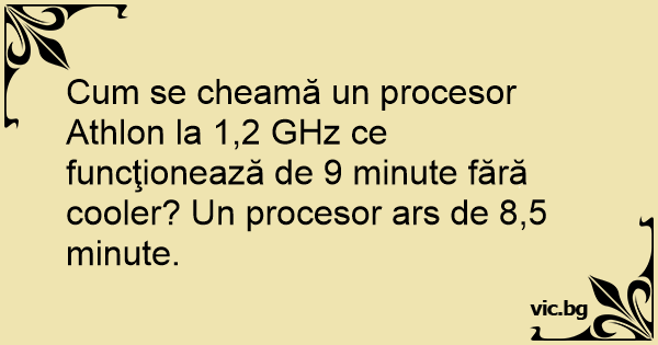 Сuм se cheamă un procesor Athlon la 1,2 GHz ce funcţionează de 9 minute fără cooler? Un procesor ars de 8,5 minute.