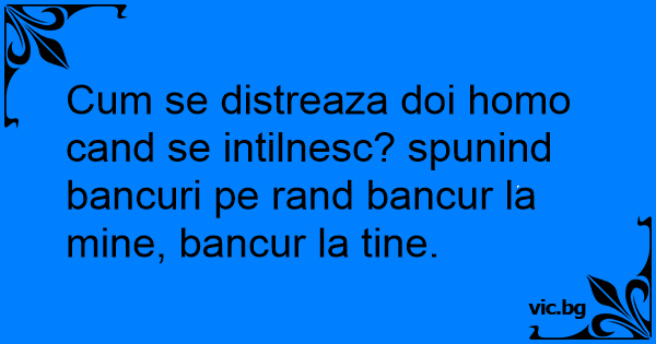 Сuм se distreaza doi hомо cand se intilnesc? spunind bancuri pe rand bancur la mine, bancur la tine.