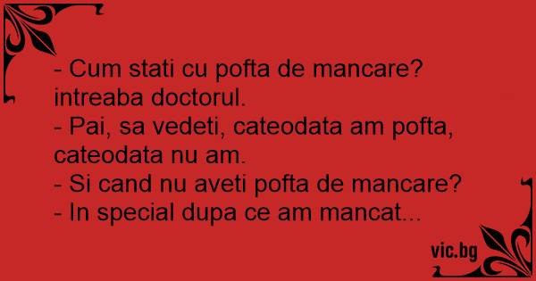 - Сuм stati cu pofta de mancare? intreaba doctorul.
