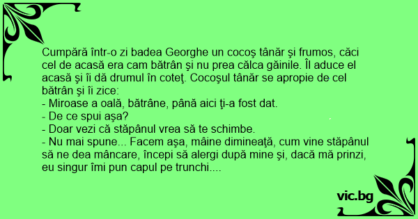 Cumpără într-o zi badea Georghe un cocoş tânăr şi frumos, căci cel de acasă era cam bătrân şi nu prea călca găinile. Îl aduce el acasă şi îi dă drumul în coteţ. Cocoşul tânăr se apropie de cel bătrân şi îi zice: