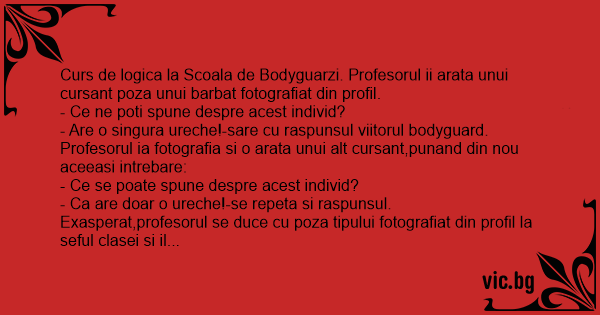 Curs de logica la Scoala de Bodyguarzi. Profesorul ii arata unui cursant poza unui barbat fotografiat din profil.