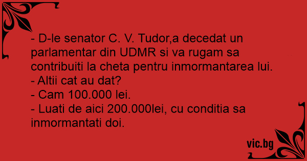 - D-le senator C. V. Tudor,a decedat un parlamentar din UDMR si va rugam sa contribuiti la cheta pentru inmormantarea lui.