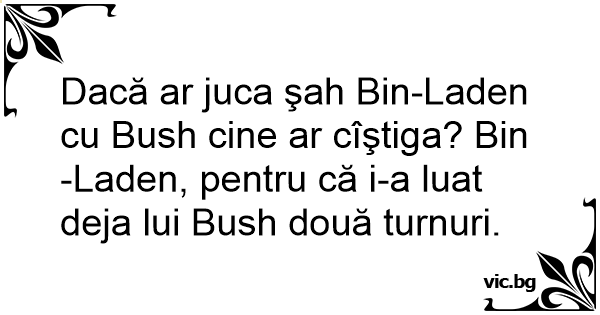 Dacă ar juca şah Bin-Laden cu Bush cine ar cîştiga? Bin-Laden, pentru că i-a luat deja lui Bush două turnuri.