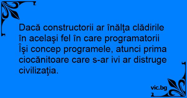 Dacă constructorii ar înălţa clădirile în acelaşi fel în care programatorii Îşi concep programele, atunci prima ciocănitoare care s-ar ivi ar distruge civilizaţia.