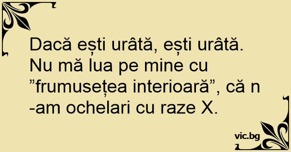 Dacă ești urâtă, ești urâtă. Nu mă lua pe mine cu ”frumusețea interioară”, că n-am ochelari cu raze X.