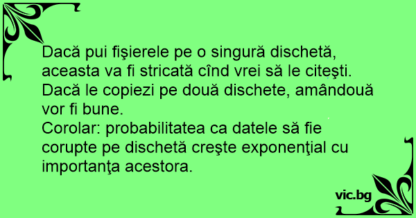 Corolar: probabilitatea ca datele să fie corupte pe dischetă creşte exponenţial cu importanţa acestora.