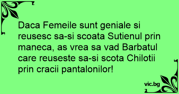 Daca Femeile sunt geniale si reusesc sa-si scoata Sutienul prin maneca, as vrea sa vad Barbatul care reuseste sa-si scota Chilotii prin cracii pantalonilor!