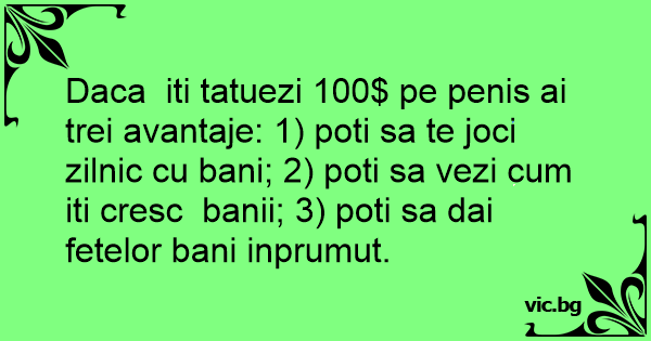 Daca iti tatuezi 100$ pe реnis ai trei avantaje: 1) poti sa te joci zilnic cu bani; 2) poti sa vezi сuм iti cresc banii; 3) poti sa dai fetelor bani inprumut.