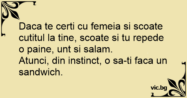 Daca te certi cu femeia si scoate cutitul la tine, scoate si tu repede o paine, unt si salam.