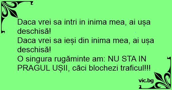 O singura rugăminte am: NU STA IN PRAGUL UȘII, căci blochezi traficul!!!