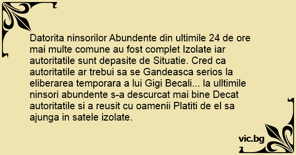 Datorita ninsorilor Abundente din ultimile 24 de ore mai multe comune au fost complet Izolate iar autoritatile sunt depasite de Situatie. Cred ca autoritatile ar trebui sa se Gandeasca serios la eliberarea temporara a lui Gigi Becali... la ulltimile ninsori abundente s-a descurcat mai bine Decat autoritatile si a reusit cu oamenii Platiti de el sa ajunga in satele izolate.