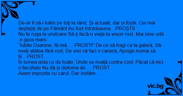 “Iubite Doamne, fă-mă…. PROST!” De ce să tragi ca la galeră, Să-nveţi atâtea fără rost, De vrei să faci o carieră, Ajunge numai să fii…PROST.