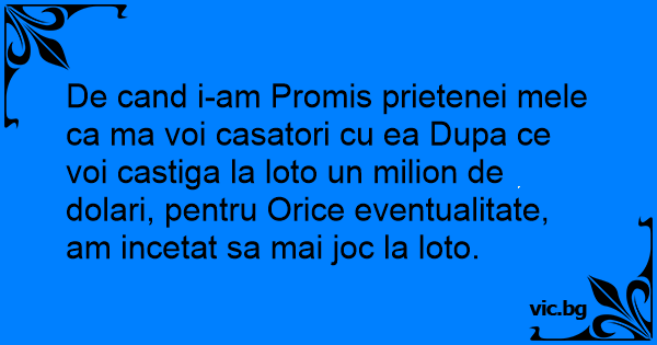 De cand i-am Promis prietenei mele ca ma voi casatori cu ea Dupa ce voi castiga la loto un milion de dolari, pentru Orice eventualitate, am incetat sa mai joc la loto.