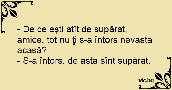 - De ce eşti atît de supărat, amice, tot nu ţi s-a întors nevasta acasă?