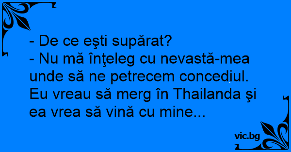 - Nu mă înţeleg cu nevastă-mea unde să ne petrecem concediul. Eu vreau să merg în Thailanda şi ea vrea să vină cu mine...