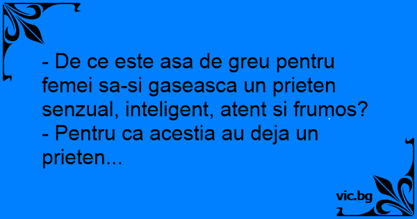 - De ce este asa de greu pentru femei sa-si gaseasca un prieten senzual, inteligent, atent si frumos? - Pentru ca acestia au deja un prieten...