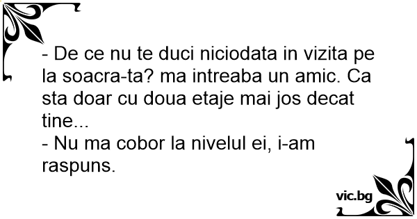 - De ce nu te duci niciodata in vizita pe la soacra-ta? ma intreaba un amic. Ca sta doar cu doua etaje mai jos decat tine...