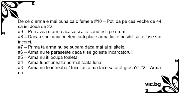 #3 – Arma nu te intreaba “Tocul asta ma face sa arat grasa?” #2 – Arma nu se enerveaza daca, dup ace o folosesti, mergi la culcare.