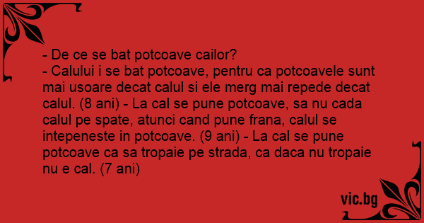 - Calului i se bat potcoave, pentru ca potcoavele sunt mai usoare decat calul si ele merg mai repede decat calul. (8 ani) - La cal se pune potcoave, sa nu cada calul pe spate, atunci cand pune frana, calul se intepeneste in potcoave. (9 ani) - La cal se pune potcoave ca sa tropaie pe strada, ca daca nu tropaie nu e cal. (7 ani)
